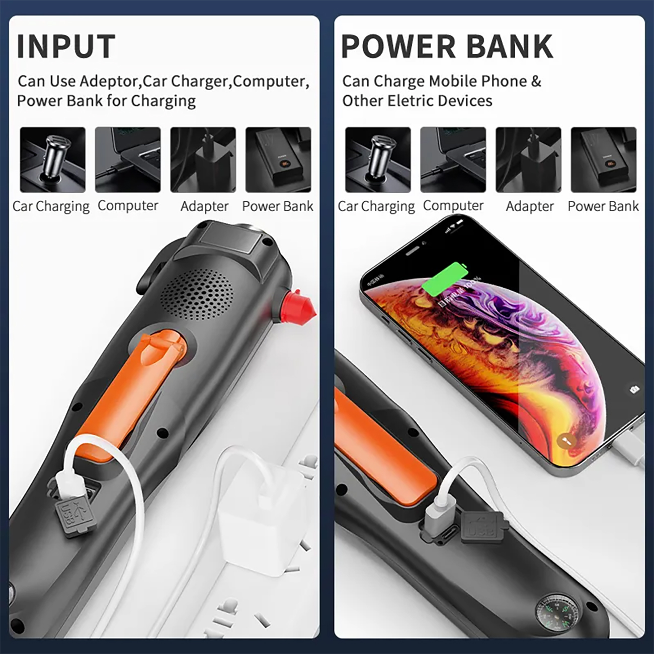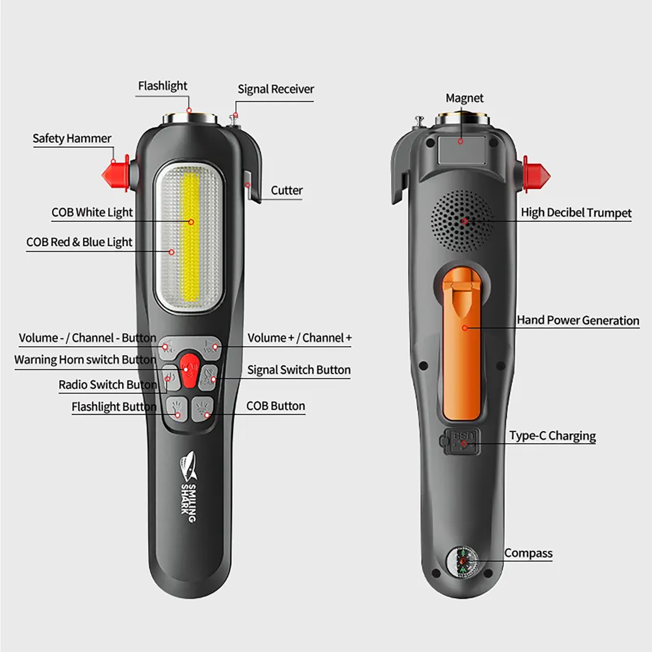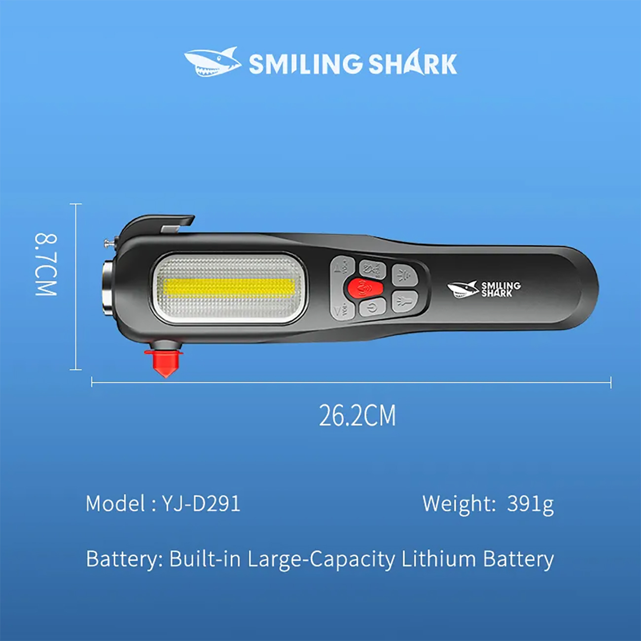Smiling shark YJD291 نه تنها یک پاوربانک و چراغ قوه کارآمد است، بلکه با قابلیتهای زیادی که دارد بعنوان قطب نما، شیشه شکن، رادیو با موج FM/AM و تولید برق دستی در سفرها به کمک شما میشتابد.
