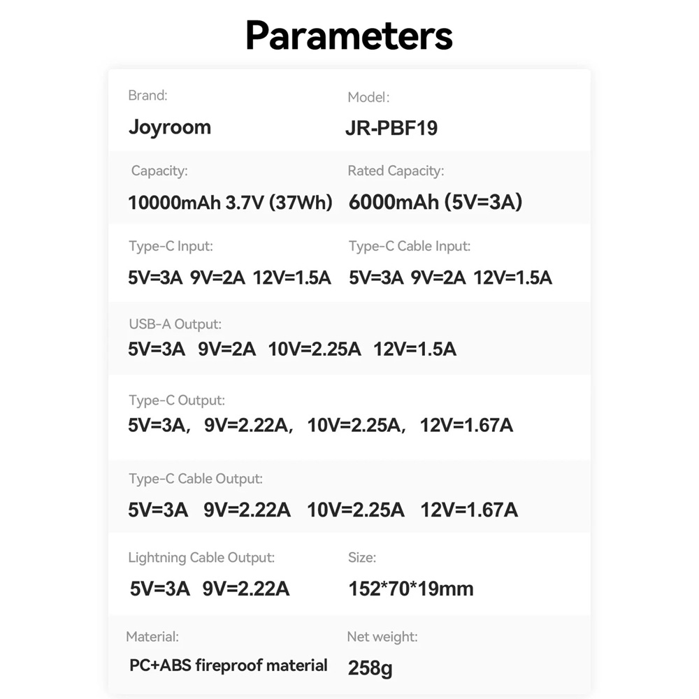 | توان خروجی | USB-A Output:5V=3A,9V=2A,10V=2.25A,12V=1.5A(22.5W) Type-C Output:5V=3A,9V=2.22A,10V=2.25A,12V=1.67A(20W) Type-C Cable Output:5V=3A,9V=2.22A,10V=2.25A,12V=1.67A(22.5W) Lightning Cable Output:5V=3A,9V=2.22A(20W) Total Output:5V=3A(Max) |