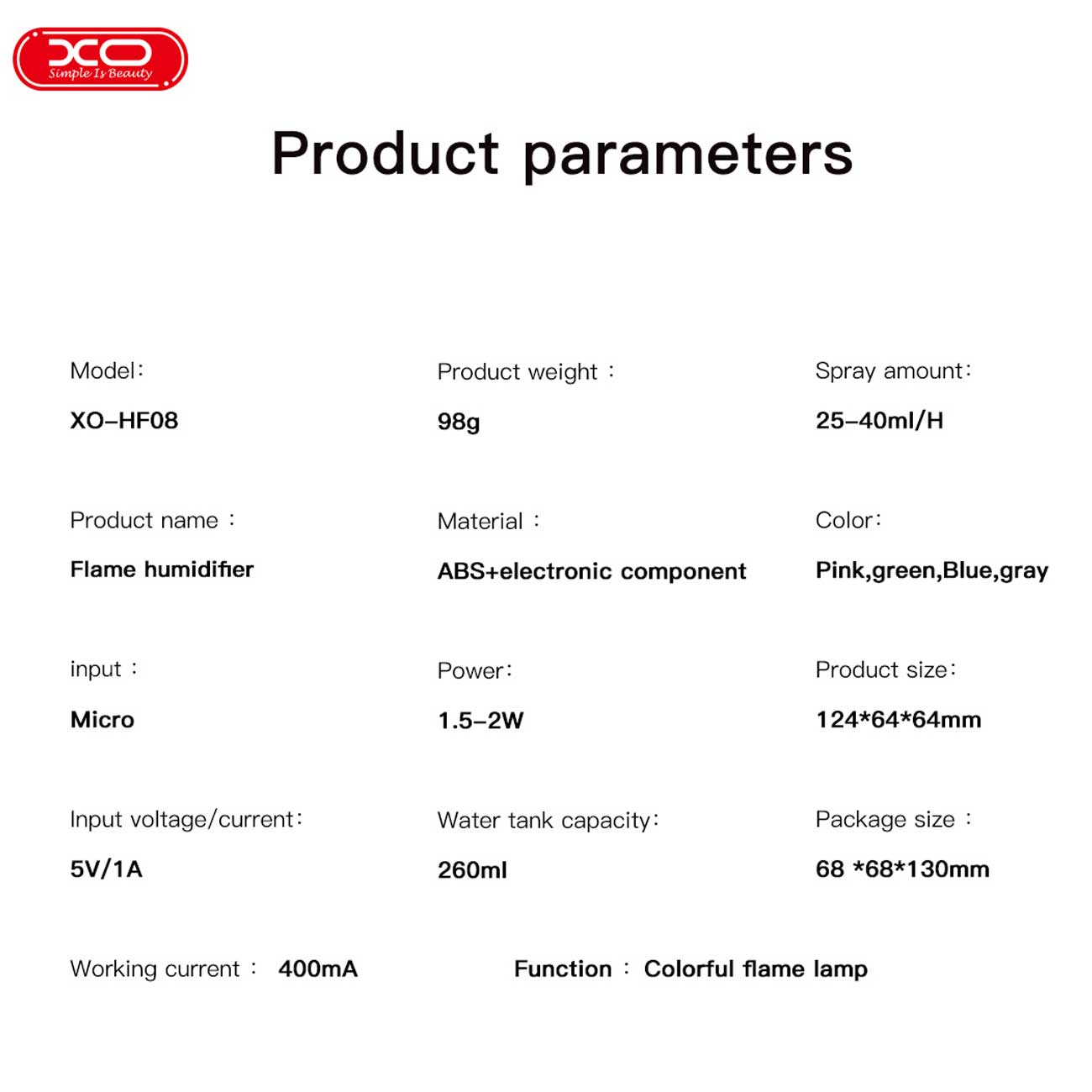 XO humidifier HF08 RGB light 260 ml