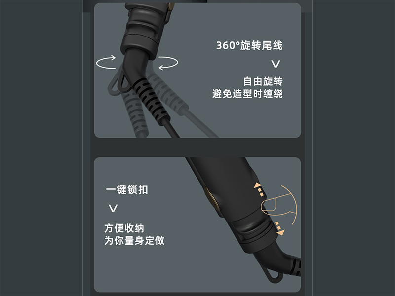 اتو مو مخصوص موهای کوتاه ریوا دارای یک کابل 1.8 متری با قابلیت چرخش 360 درجه بوده که برای جلوگیری از گره خوردن در هنگام استفاده بسیار کارآمد است و کاملا می چرخد. به علاوه یک دکمه برای قفل کردن بر روی دسته آن تعبیه شده که تا استفاده از آن برای شما آسانتر باشد.دکمه را به بالا فشار دهید تا قفل شود و اگر دکمه به سمت پایین کشیده شود قفل باز میشود. طراحی این قفل فضا را اشغال نمیکند.