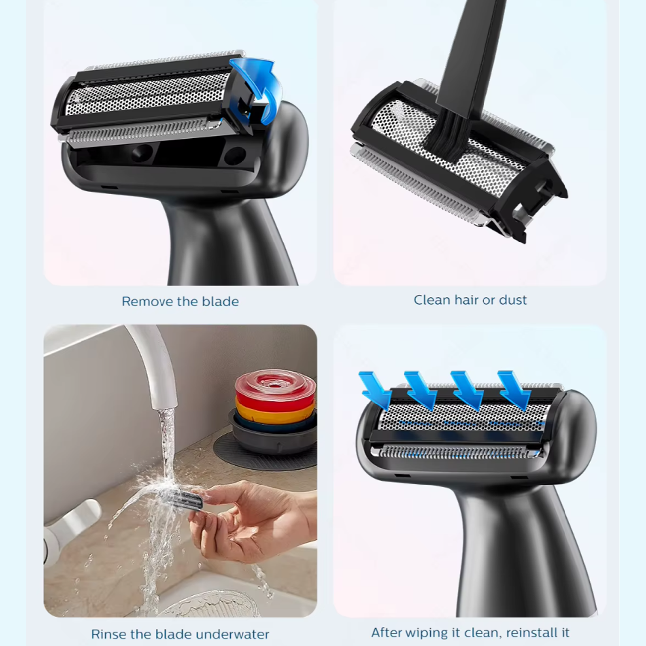 تیغههای ضدزنگ دستگاه قابل جدا شدن هستند و میتوان آنها را زیر آب شستوشو داد. برای تمیزکاری سریع نیز برس مخصوصی در بسته وجود دارد تا موهای باقیمانده بین تیغهها را بهراحتی پاک کنید. طراحی ضدآب، مقاومت بالای بدنه و ساختار سادهی جداسازی قطعات، باعث افزایش طول عمر دستگاه و حفظ عملکرد آن در طول زمان میشود.