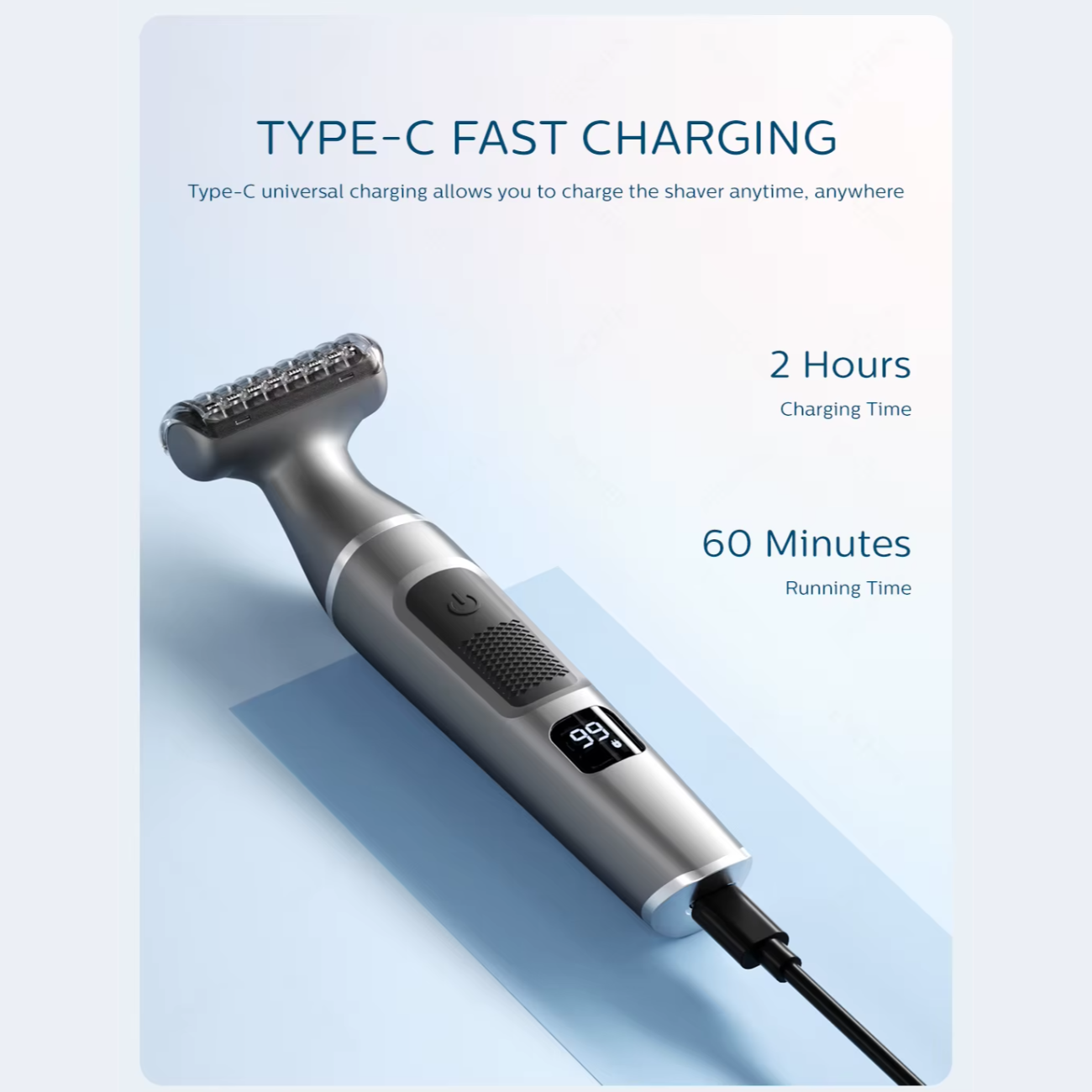 درون دستگاه یک باتری لیتیوم-یون با ظرفیت 600 میلیآمپر ساعت قرار دارد که با یک بار شارژ کامل در مدت حدود 2 ساعت، تا 60 دقیقه عملکرد مداوم ارائه میدهد. این میزان شارژدهی برای چندین بار اصلاح کامل بدن کافی است. باتری از طریق درگاه USB-C شارژ میشود و به راحتی با هر آداپتور 5 ولت و 1 آمپر یا حتی پاوربانک شارژ میشود. این ویژگی باعث میشود دستگاه گزینهای عالی برای سفر و استفاده روزمره باشد.