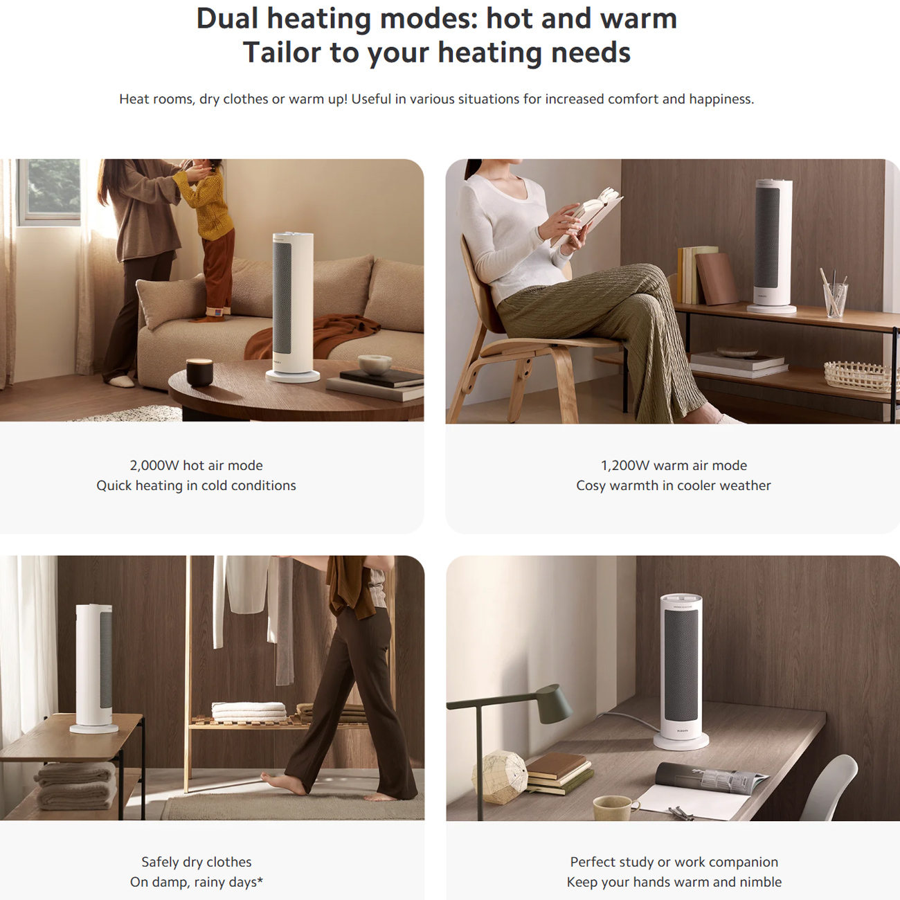 فن هیتر شیائومی با دو حالت گرمایی هوای داغ (2000 وات) و هوای گرم ملایم (1200 وات) طراحی شده تا در هر شرایط دمایی عملکردی متناسب و بهینه ارائه دهد. در روزهای بسیار سرد سال، حالت هوای داغ با توان بالا، گرمای فوری و قدرتمندی تولید میکند تا سرمای محیط در کوتاهترین زمان از بین برود. در مقابل، زمانی که تنها به گرمایی لطیف برای حفظ دمای متعادل نیاز دارید، میتوانید حالت هوای گرم ملایم را فعال کنید تا علاوهبر صرفهجویی در مصرف انرژی، محیطی آرام و دلپذیر داشته باشید. این تنوع در تنظیم دما، استفاده از بخاری را برای فضاهای مختلف مانند اتاق خواب، محیط کار یا حتی خشککردن لباسها در روزهای مرطوب، کاملاً کاربردی و کارآمد میسازد.