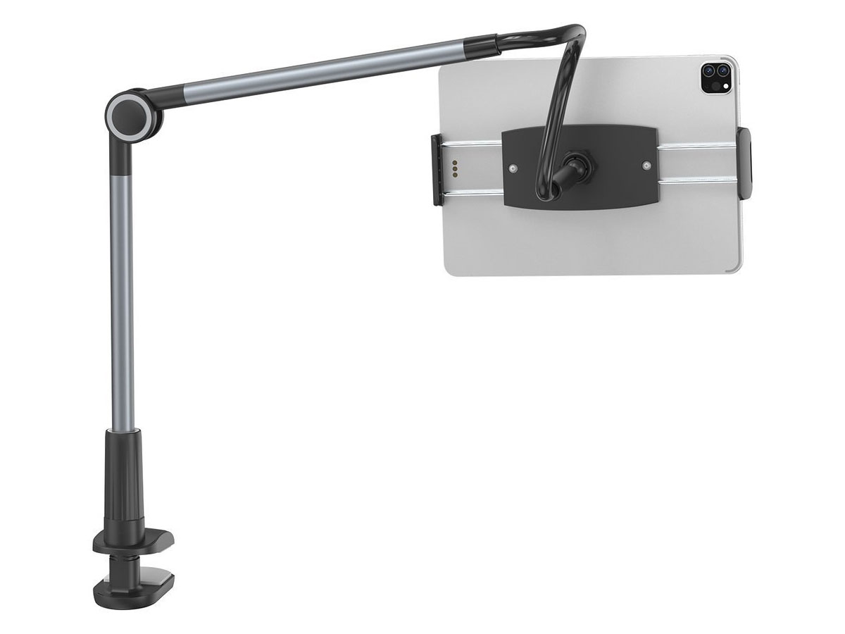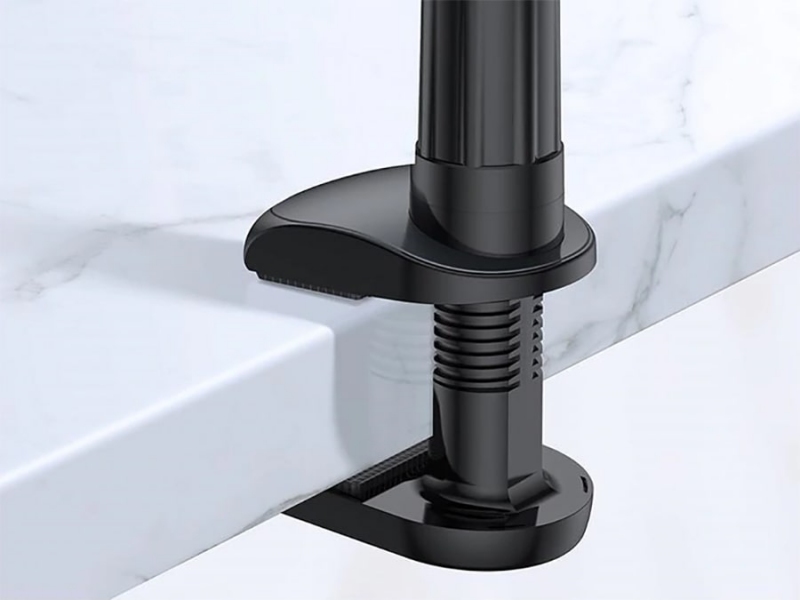انتهای پایه ثابت این استند طراحی پیچی دارد. کاربران با پیچاندن انتهای پایه میتوانند دهانه پایه استند را متناسب با اندازه ضخامت میز یا لبه سطح مورد نظر باز کنند. با قرار دادن دهانه پایه روی لبه میز کافی است کاربران دومرتبه پیچ را بپیچانند تا بسته شده و محل قرارگیری پایه روی میز محکم شود.