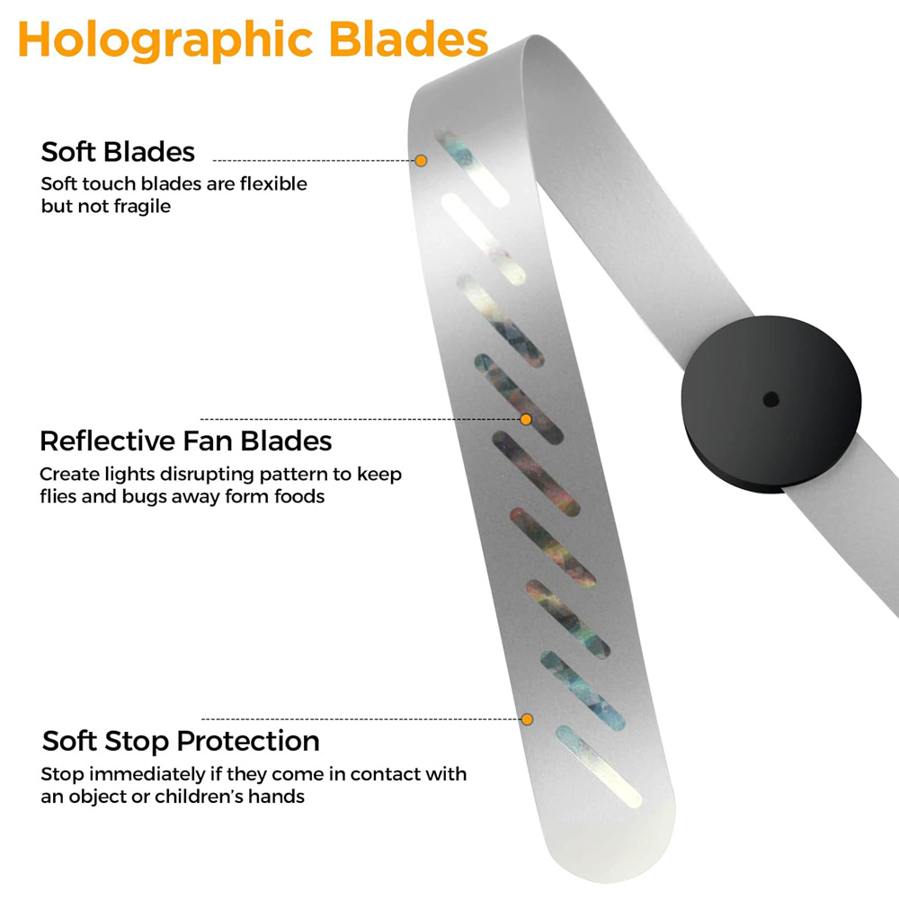 این فن دافع حشرات و درعین حال دوستدار محیط زیست از چیزی بیش از جابجا کردن هوا توسط تیغه هایی نرم استفاده نمی کند این فن به طور موثری غذا و نوشیدنی شما را در منطقه تحت پوشش خود از دسترس حشرات پرنده دور نگاه می دارد.