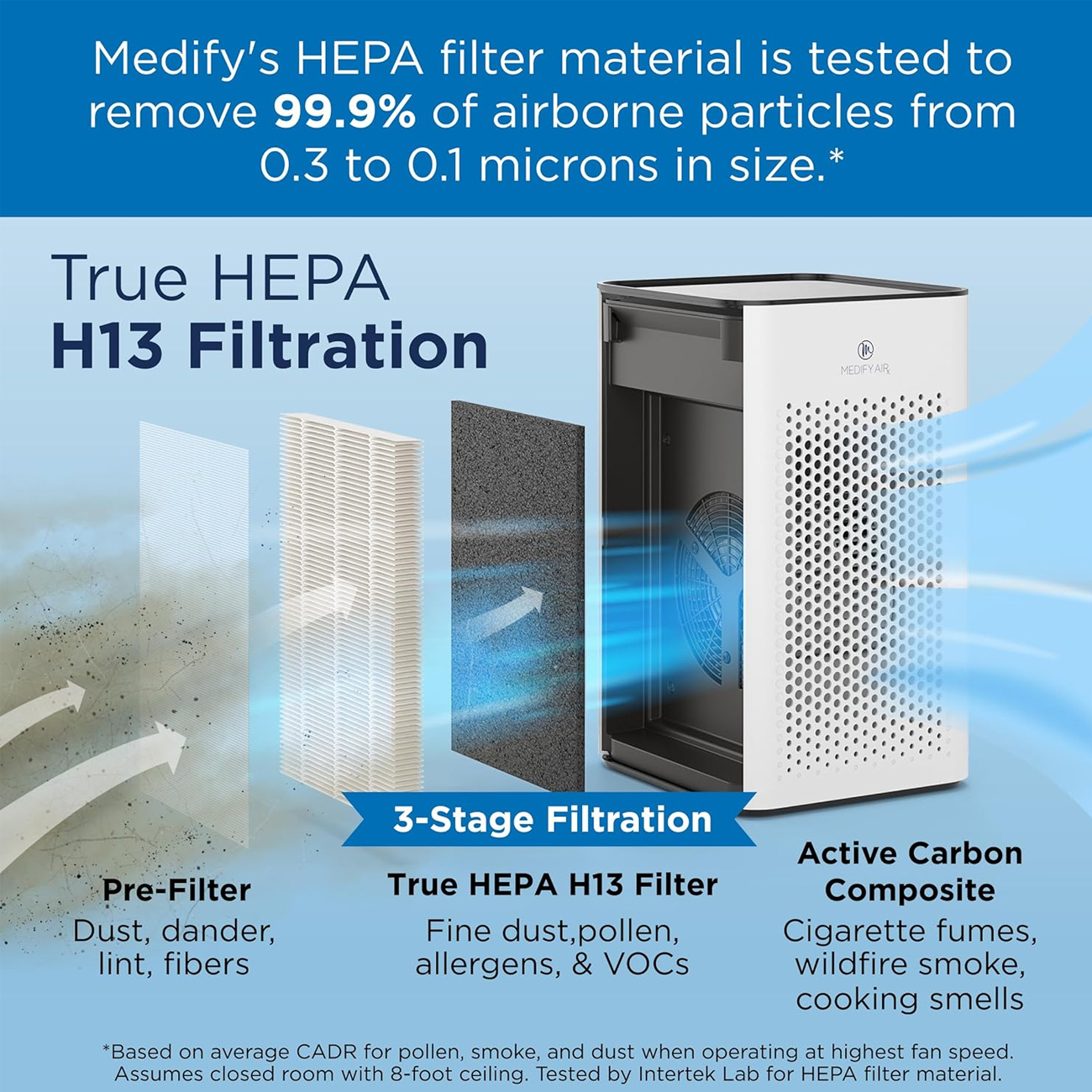 فیلتر True HEPA H13 یکی از مهمترین ویژگیهای MA-25 است که توسط آزمایشگاه Intertek تایید شده است. این فیلتر 99.9% ذرات معلق با اندازه 0.1 تا 0.3 میکرون را جذب میکند و شامل آلرژنها، گرد و غبار، دود، ذرات حیوانات، گرده، ذرات حاصل از آتشسوزی و VOCها میشود. وجود این فیلتر باعث میشود هوا در محیط شما به سطحی کاملاً پاک و سالم برسد. فیلتراسیون سهمرحلهای شامل پیشفیلتر، فیلتر HEPA و فیلتر کربن فعال، کارایی دستگاه را دوچندان میکند.