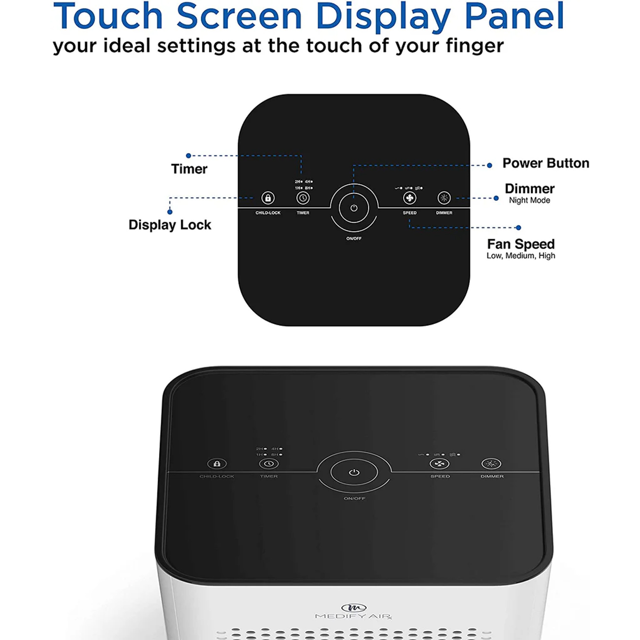 پنل لمسی دستگاه شامل تایمر 0-8 ساعت، انتخاب سرعت فن در سه حالت، حالت خواب، قفل کودک و نشانگر تعویض فیلتر است. این قابلیتها استفاده از دستگاه را آسان و ایمن میکند. قابلیت قفل کودک باعث امنیت بیشتر محیط میشود و نشانگر تعویض فیلتر، زمان مناسب برای جایگزینی فیلترها را اطلاع میدهد.