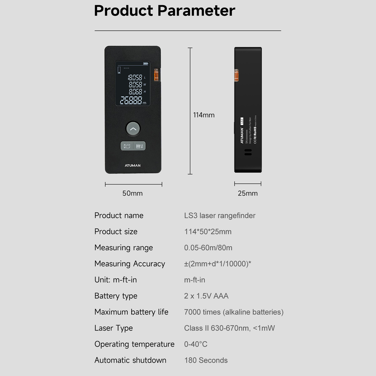 متر لیزری دیجیتال آتومن Atuman اصل مدل LS3 با 8 حالت اندازهگیری